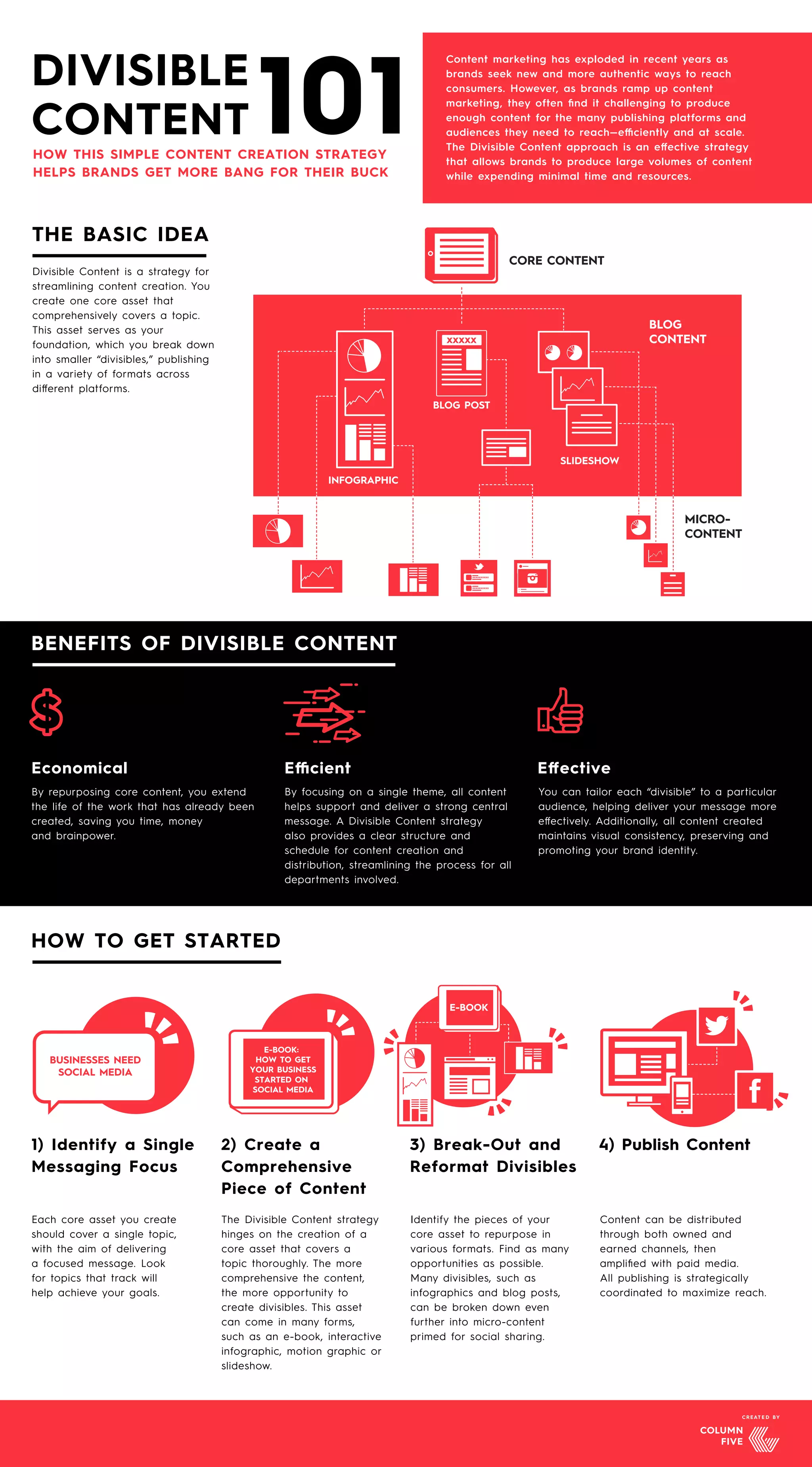 The document discusses the divisible content strategy, which enables brands to create large volumes of content efficiently by repurposing a single core asset into various formats. This approach streamlines content creation and distribution, helping brands save time and money while effectively reaching diverse audiences. Key steps include identifying a focused messaging theme, creating a comprehensive core asset, and breaking it down into smaller 'divisibles' for strategic publishing.