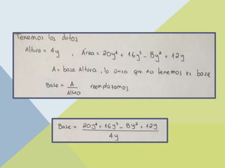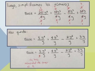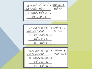 El documento explica el proceso de división de monomios y polinomios, incluyendo ejemplos prácticos y metodologías como la división habitual y la división sintética (regla de Ruffini). Se proporcionan pasos detallados para realizar estas divisiones y se presentan ejercicios para practicar. Además, se ofrece acceso a más recursos y ejercicios a través de una cuenta de Instagram y un sitio web.