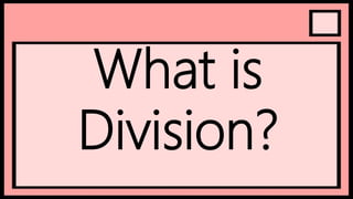 Division is one of the four basic mathematical operations. It involves splitting a number, called the dividend, into equal groups or parts using another number, called the divisor, to find the quotient. There are two forms of writing division - horizontal uses the division symbol ÷, while vertical stacks the dividend above the divisor with the answer below. Division is the opposite of multiplication, so if you know a multiplication fact you can derive the corresponding division fact.