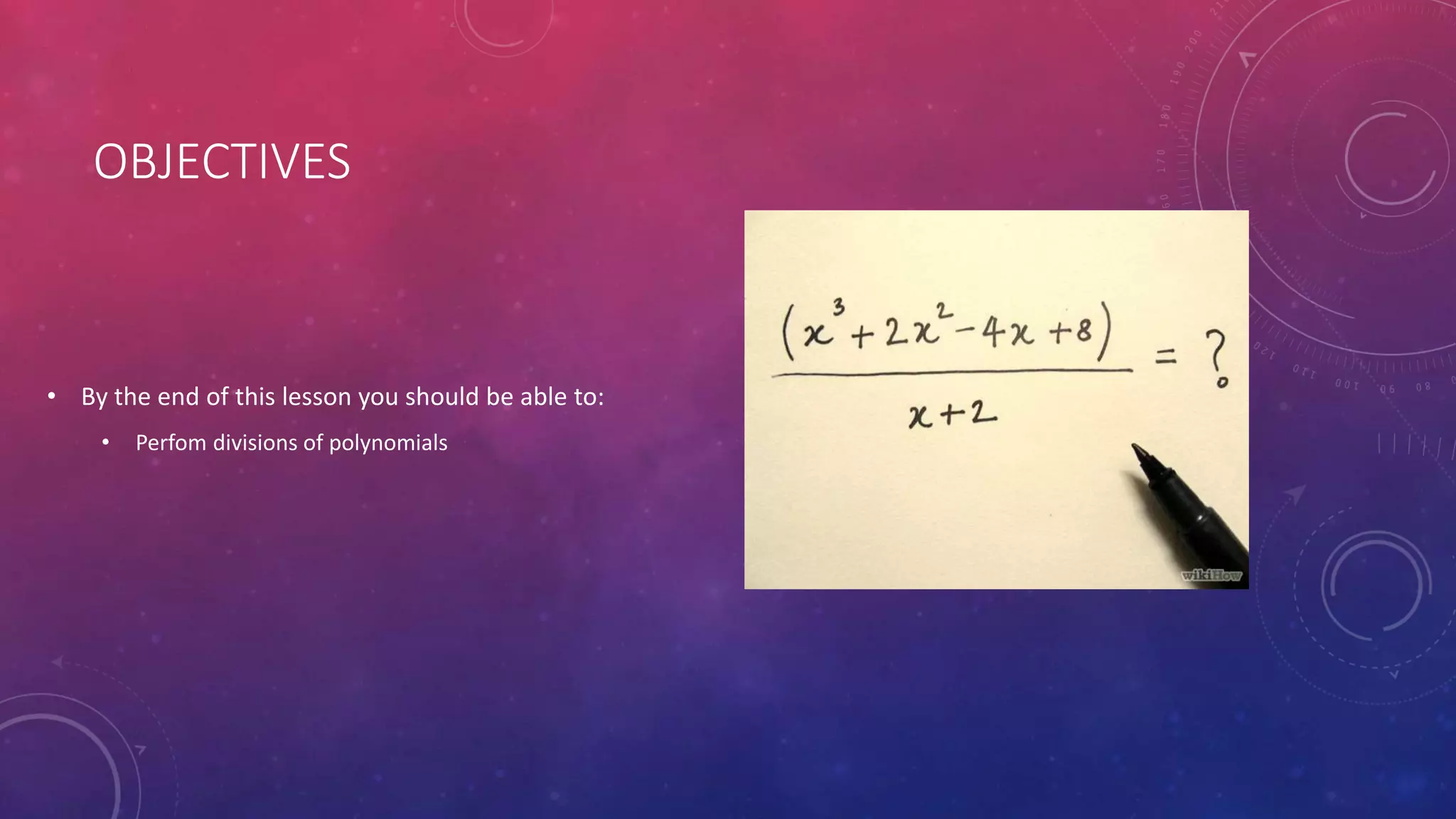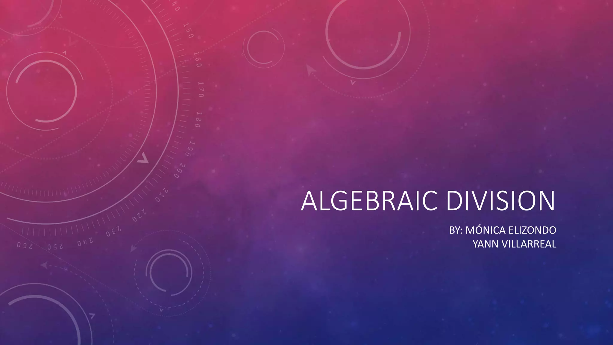 This document discusses algebraic division of polynomials. It begins by explaining the laws of exponents used in polynomial division. Specifically, it covers dividing powers of the same base and the meaning of the zero exponent. It then describes the three types of algebraic division: division of monomials, division of a polynomial by a monomial, and division of two polynomials. Steps for performing each type of division are provided. An example problem demonstrates dividing two polynomials.