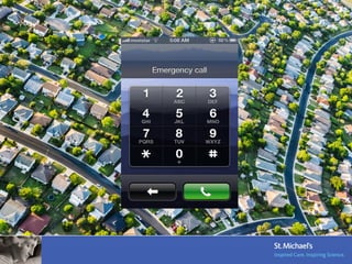 This document describes a study that developed a smartphone application called "9-1-1 Heroes" to teach emergency skills to children. The study team included doctors, researchers, developers and others. Children participated in baseline and post assessments involving simulated emergency situations. Between assessments, participants received either a 45 minute educational session involving didactic teaching and simulations using the app, or traditional teaching. Results showed the intervention group identifying emergencies at a higher rate than the traditional group. Further development and research on the app and simulations teaching is planned.