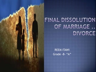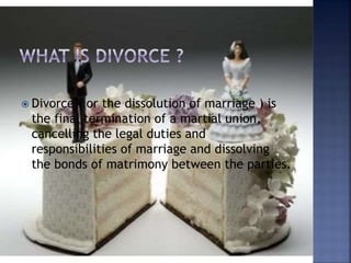1) Divorce terminates a marital union by cancelling legal marriage duties and dissolving matrimonial bonds between parties.