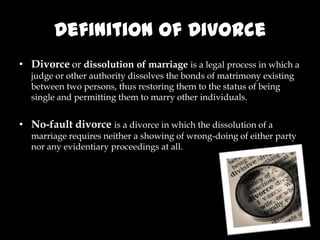 Divorce is a legal process that dissolves a marriage and restores individuals to single status. No-fault divorce does not require proof of wrongdoing. Around 50% of first marriages, 67% of second, and 74% of third marriages end in divorce. Children of divorced parents are more likely to have problems in school, abuse substances, and divorce as adults. After divorce, 90% of mothers have custody while divorced men struggle with relationships and debt. Divorce rates vary globally with the US having the highest rate at 4.95 per 1000 people. Around 25% of mainline Protestants and Catholics have been divorced. Some argue polygamy provides stability and childcare support while others say it goes against
