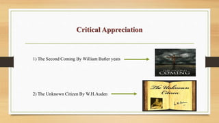 This document provides critical analysis of two poems: "The Second Coming" by William Butler Yeats and "The Unknown Citizen" by W.H. Auden. It summarizes the key details and themes of each poem in 1-2 sentences. For "The Second Coming," it describes the poem's use of Christian imagery to allegorically depict post-war Europe and the return of a cruel new era. For "The Unknown Citizen," it explains that the poem satirizes life in a regimented state where individuality is lost and people are known only by numbers.
