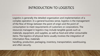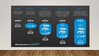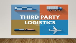 This document discusses third-party logistics (3PL). It defines 3PL as outsourcing elements of distribution, warehousing, and fulfillment to specialized third-party providers. Using 3PL allows companies to benefit from logistics expertise without deploying internal resources. It also provides flexibility and scalability. The document outlines benefits of 3PL like cost savings, access to expertise, ability to focus on core competencies, and improved customer satisfaction. The third-party logistics market in India is growing due to reforms like the Goods and Services Tax.