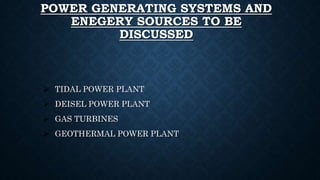 This document discusses tidal power plants and how they generate electricity from tidal energy. Tidal power plants use large barriers built across tidal passages to capture the potential energy of rising and falling tides. As the tides shift, the water height difference across the barrier is used to drive turbines connected to generators to produce electricity. The largest operational tidal power plant is the 254 MW Sihwa Lake Tidal Power Plant in South Korea. The document also outlines some advantages and disadvantages of tidal power plants such as being pollution-free but having irregular power supply.