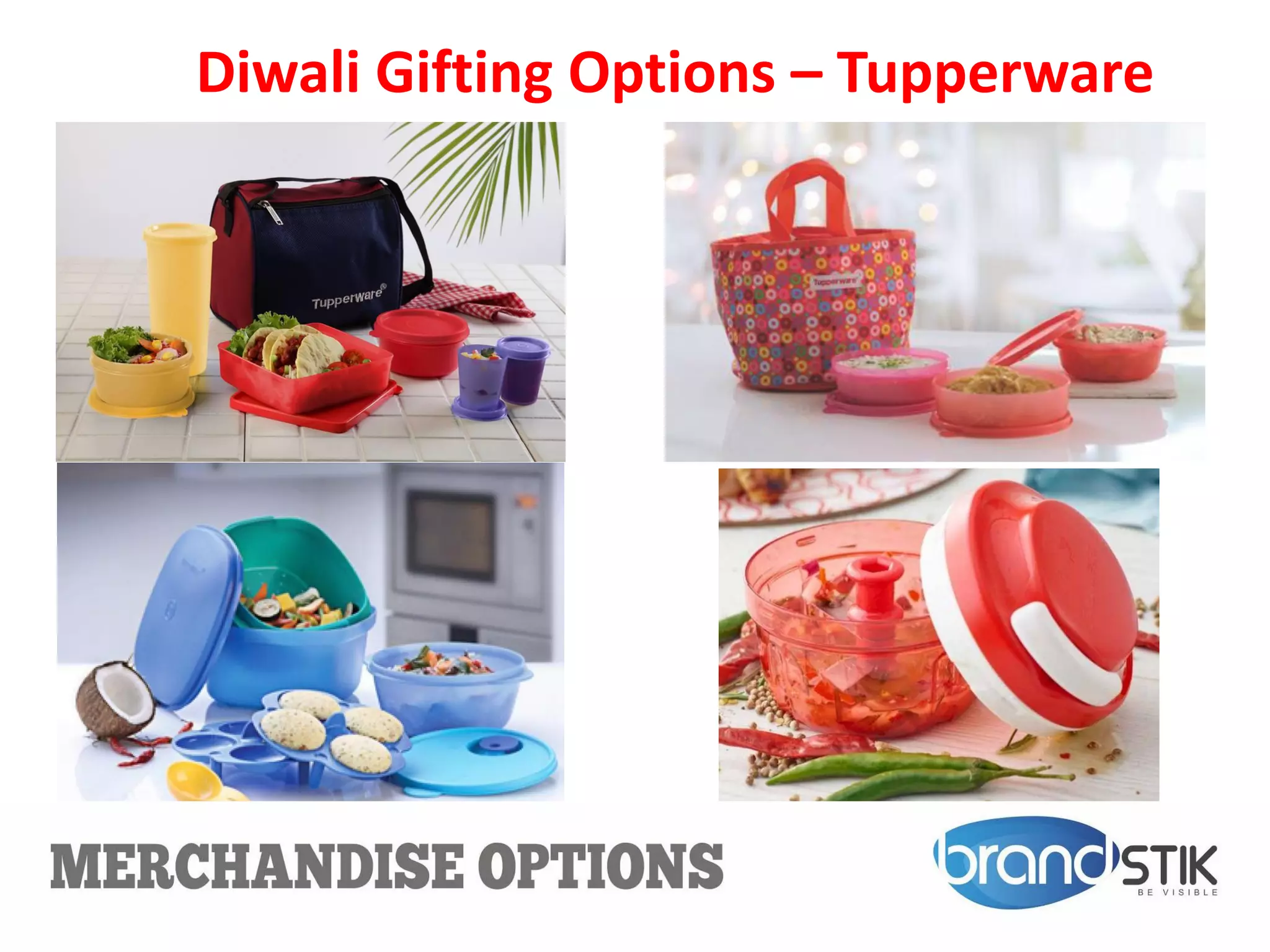 This document provides options for Diwali gifting from Tupperware, including various lunch and food storage sets, water bottles, choppers, mugs, and tumblers. Details are given for each product like what it includes, size, and quantity. Packaging, delivery and payment terms are also mentioned. Gift cards and vouchers are listed as an option. The document aims to offer different Tupperware products that can be considered as gifts for Diwali.
