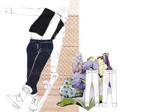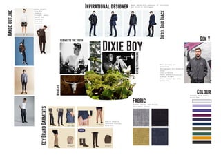 This document summarizes a collection of 5 menswear trousers created by Dixie Boy for an Italian trouser company called Equipage. The collection was aimed at a younger consumer and took inspiration from rebel denim with touches of tailoring and sportswear. The range included styles like slim fit jeans, joggers, straight jeans, carrot leg trousers, and wide leg trousers made from fabrics like cord, raw denim, and sportswear jersey in colors like orchid, plum tones, and brick red.