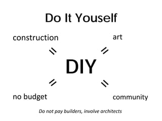 This document discusses do-it-yourself architecture and construction using recycled and natural materials. It provides examples of DIY housing projects from around the world that reuse items like windows, doors, bottles, cans, shipping containers, tubes, and natural materials like wood, straw, earth, and cob. These projects showcase affordable, sustainable building methods with little to no budget that empower communities and encourage shared economies.