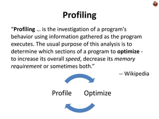 This document discusses different approaches for profiling Java applications without using third-party tools. It begins by explaining the benefits of a do-it-yourself approach such as avoiding reliability and compliance concerns with tools. Various profiling types are then covered, including CPU profiling using wall clock time and calls, sampling, and memory profiling using JVM options. Bytecode manipulation is also presented as a method using ASM to add profiling code without changing sources. The document emphasizes learning the Java Virtual Machine and using its built-in capabilities for profiling purposes.
