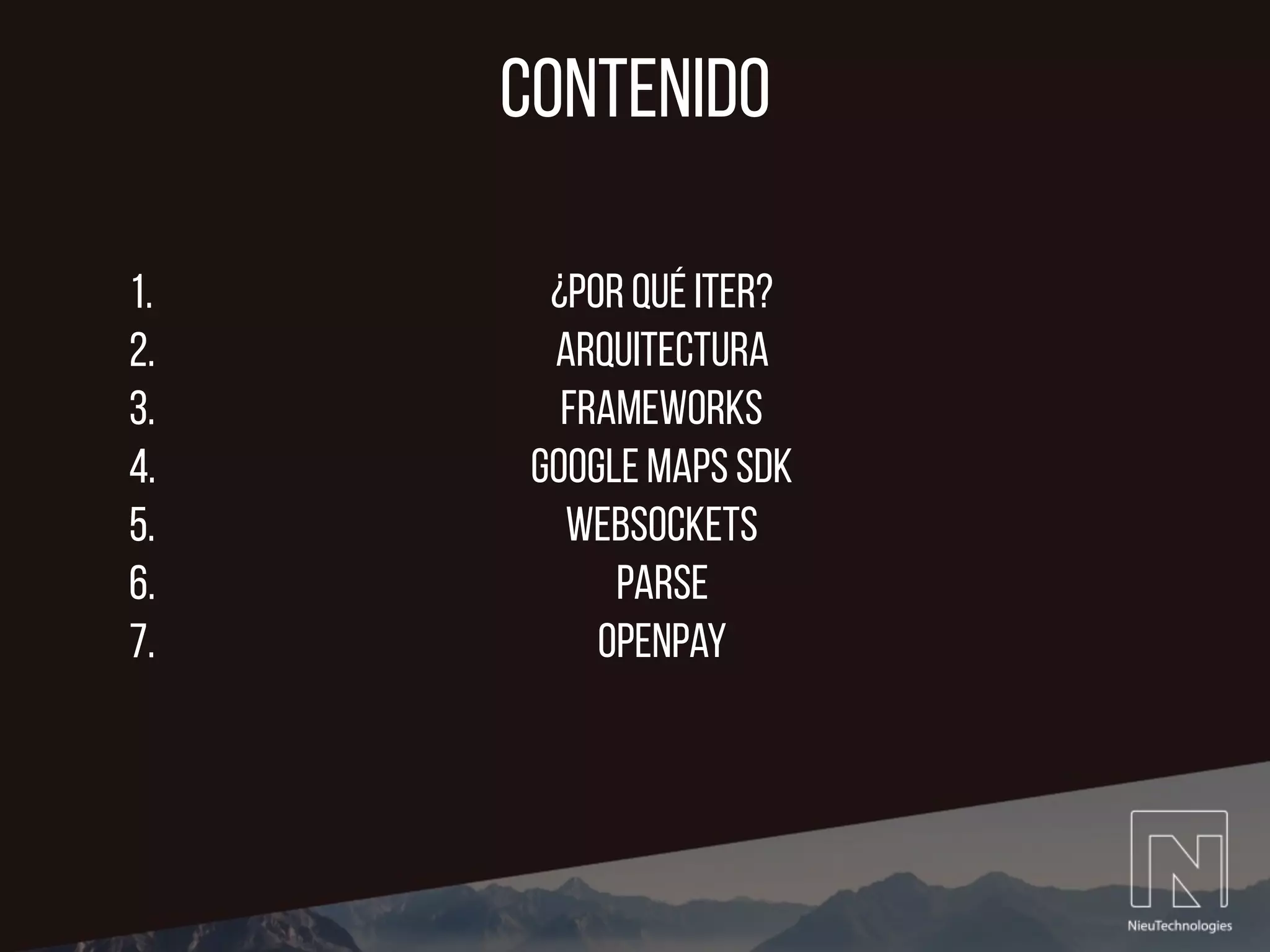 The document outlines the development of an application named 'iter' that integrates various technologies including Google Maps SDK, WebSockets, and Parse for location-based services and real-time updates. It details the implementation of location tracking, user interface components, and API interactions for handling maps, user authentication, and push notifications. Additionally, it touches on payment processing using OpenPay for transactions within the app.