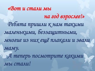 Документ описывает достижения и развитие группы детей в течение года, начиная с их первых шагов в детском саду и заканчивая празднованиями в конце года. Он подчеркивает важность мам, учебных занятий и общения с природой, а также различные活动, в которых участвовали дети, такие как танцы, творчество и новогодние праздники. В целом, текст отражает радостный процесс взросления и обучение детей через игры и совместные мероприятия.