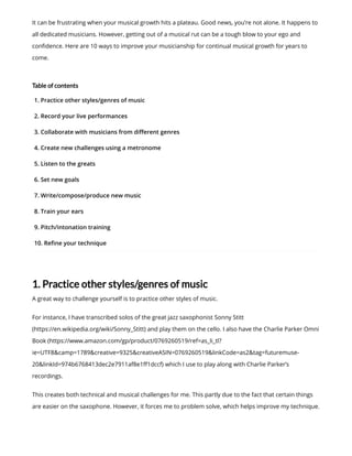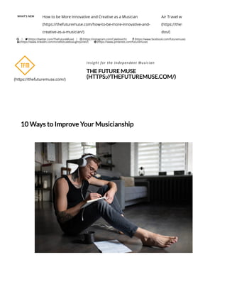 This document summarizes 10 ways to improve musicianship as outlined on the website The Future Muse. It includes suggestions such as practicing other genres to challenge yourself, recording live performances to identify areas for improvement, collaborating with musicians from different genres to learn new approaches, and setting goals to continually progress. The overall message is that dedicated practice and exploring new techniques can help musicians grow and avoid plateaus.