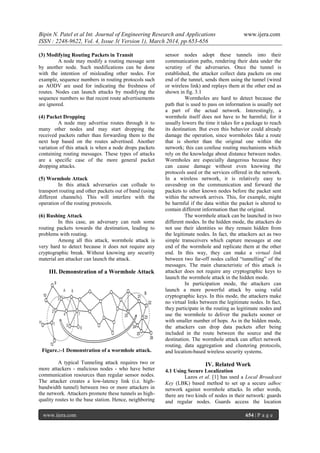 This document surveys wormhole attacks in mobile ad hoc networks (MANETs), highlighting their severe impact on routing due to the ease of their execution without cryptographic methods. It discusses various existing techniques for detecting such attacks, as well as the challenges posed by their stealthy nature. The research emphasizes the importance of developing effective security measures to safeguard MANETs from these vulnerabilities.