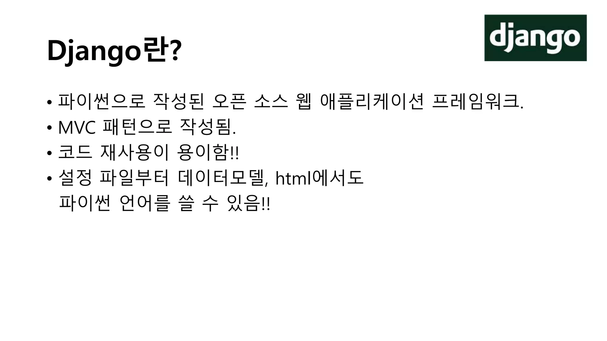 • 파이썬으로 작성된 오픈 소스 웹 애플리케이션 프레임워크.