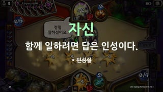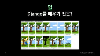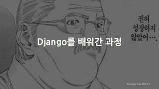 Dev Django Korea 2018 발표자료입니다. 일, 동료, 자신의 세 가지 관점으로 Django를 배우며 겪은 이야기를 풀어봅니다. 이 슬라이드는 여러분들의 도움으로 만들어졌습니다. 1차 검수 : 김승호 2차 의견 : 김영근 3차 검수: 김은향 짤빵 검수 : 박찬미