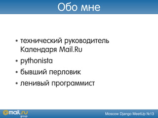 Документ представляет собой презентацию о профилировании и отладке в Django, подготовленную Владимиром Рудных на встрече Moscow Django Meetup. В нем обсуждаются методы и инструменты для измерения производительности кода, включая ручное профилирование и использование статистических профилировщиков. Также представлены примеры задач из Project Euler и практические подходы к сбору статистики времени выполнения кода.