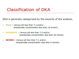 This document describes the case of an 8-year-old girl brought to the emergency department with vomiting, breathlessness, fever, and altered mental status due to diabetic ketoacidosis (DKA). Her history of type 1 diabetes and discontinuing insulin therapy for 2 days contributed to the development of DKA. On examination, she had a low blood pressure, tachycardia, and altered mental status. Laboratory findings showed high blood glucose, low bicarbonate, and ketones in the urine, consistent with DKA. She was treated according to the Milwaukee protocol for DKA, which involves slow correction of dehydration with intravenous fluids, administration of insulin, and monitoring of electrolytes and mental status. Her