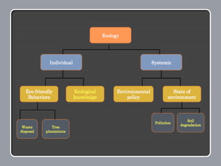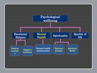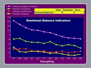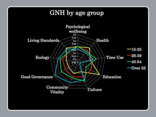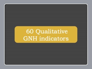 The document provides an overview of Gross National Happiness (GNH) in Bhutan. It discusses the rationale for using GNH instead of only economic measures to evaluate societal well-being. It also outlines the conceptual structure of GNH, including how it is measured using a GNH Index composed of nine domains related to both economic and non-economic areas of life. These domains are interdependent and contribute collectively to overall well-being. The document then shares some examples and tools for applying GNH at both the policy level and for individuals.