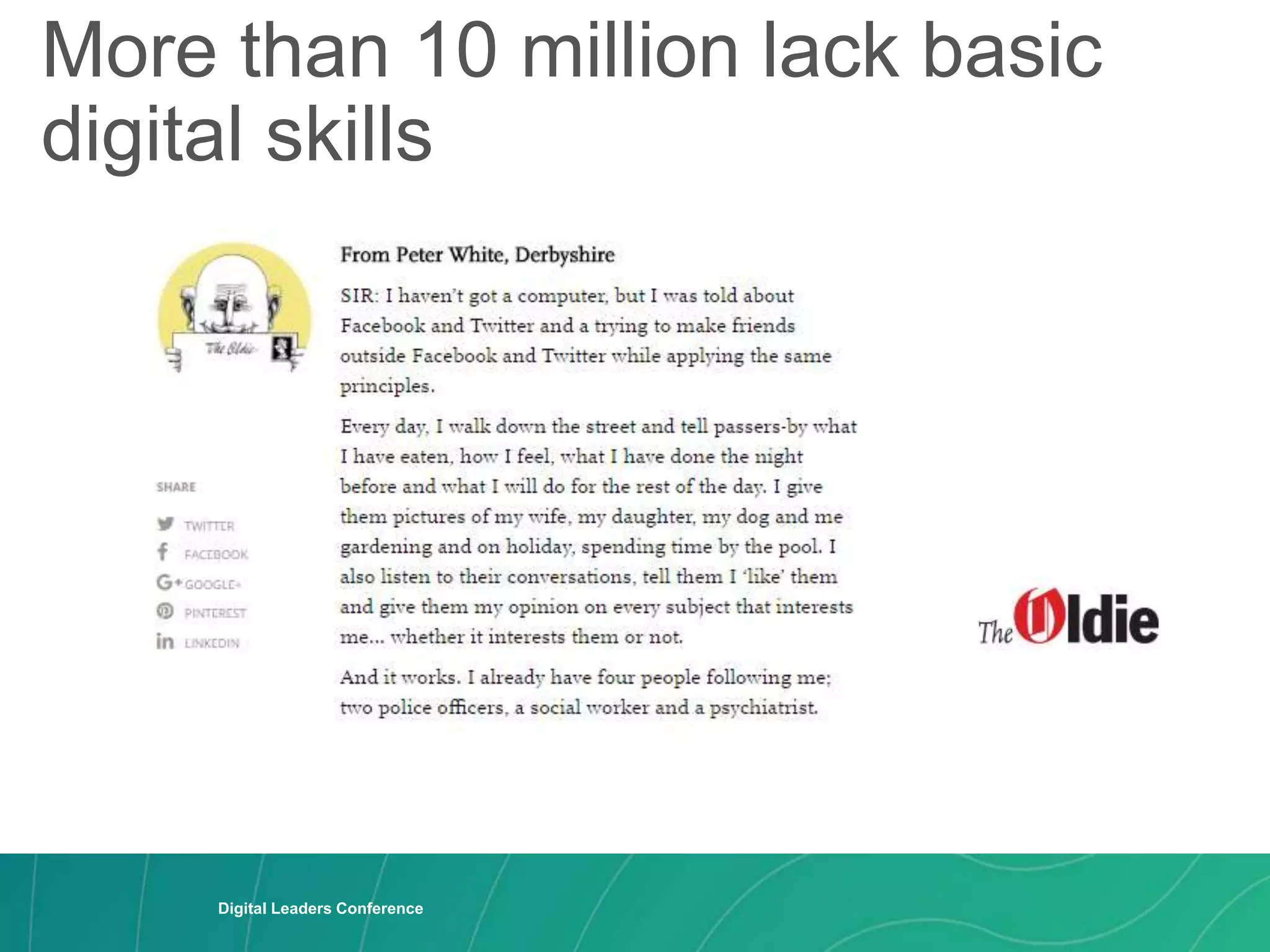 This document discusses a digital leaders conference focused on promoting digital skills and the benefits of being online. The conference covers making the case for digital skills, being effective online, and potential unintended consequences, with the goal of helping more than 10 million people who currently lack basic digital abilities.
