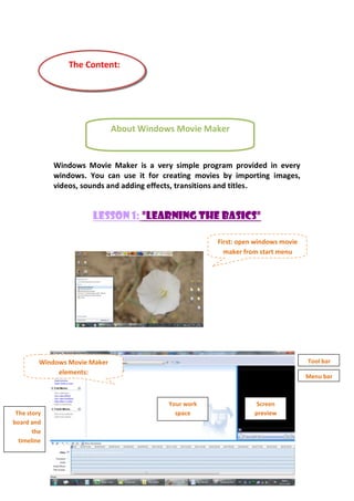 The document provides step-by-step instructions on how to use Windows Movie Maker to create a movie, including how to import media, edit the timeline, and add effects, transitions, and titles before saving the completed project.