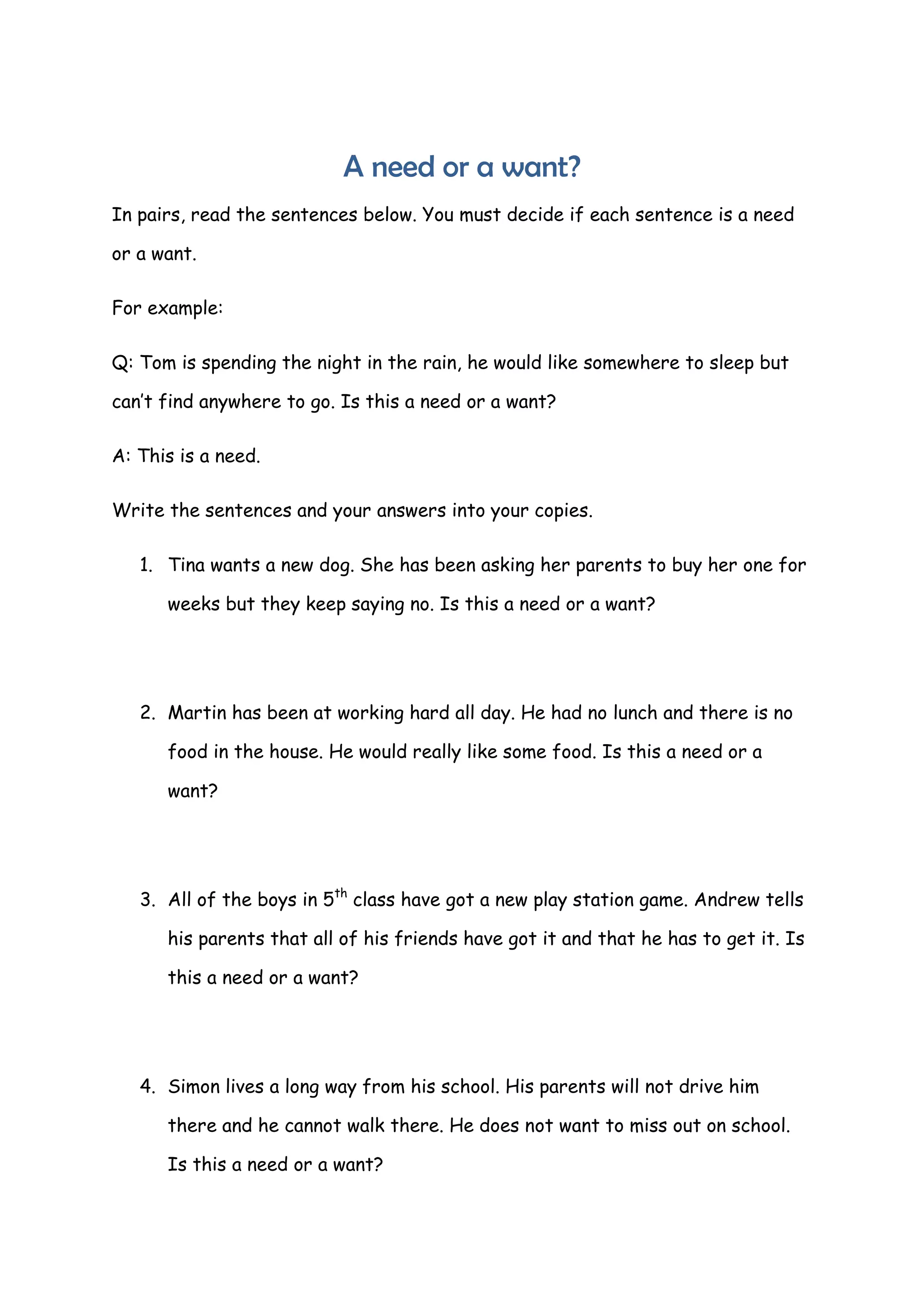 The document discusses the difference between needs and wants by presenting four scenarios and asking the reader to determine if each scenario describes a need or a want. A need is described as something essential for survival like shelter or food, while a want is described as something desired but not essential like a new toy. The summaries determine that wanting a new dog is a want, needing food when having not eaten is a need, wanting the latest video game because friends have it is a want, and needing transportation to not miss school is a need.