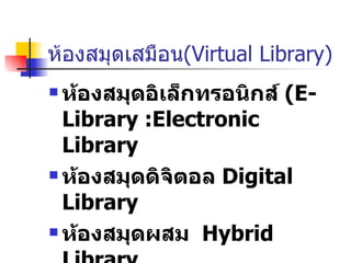 ห้องสมุด อิเล็กทรอนิกส์ (E-Library : Electronic Library ห้องสมุดดิจิตอล Digital Library ห้องสมุดผสม Hybrid Library ห้องสมุดเสมือน Virtual Library