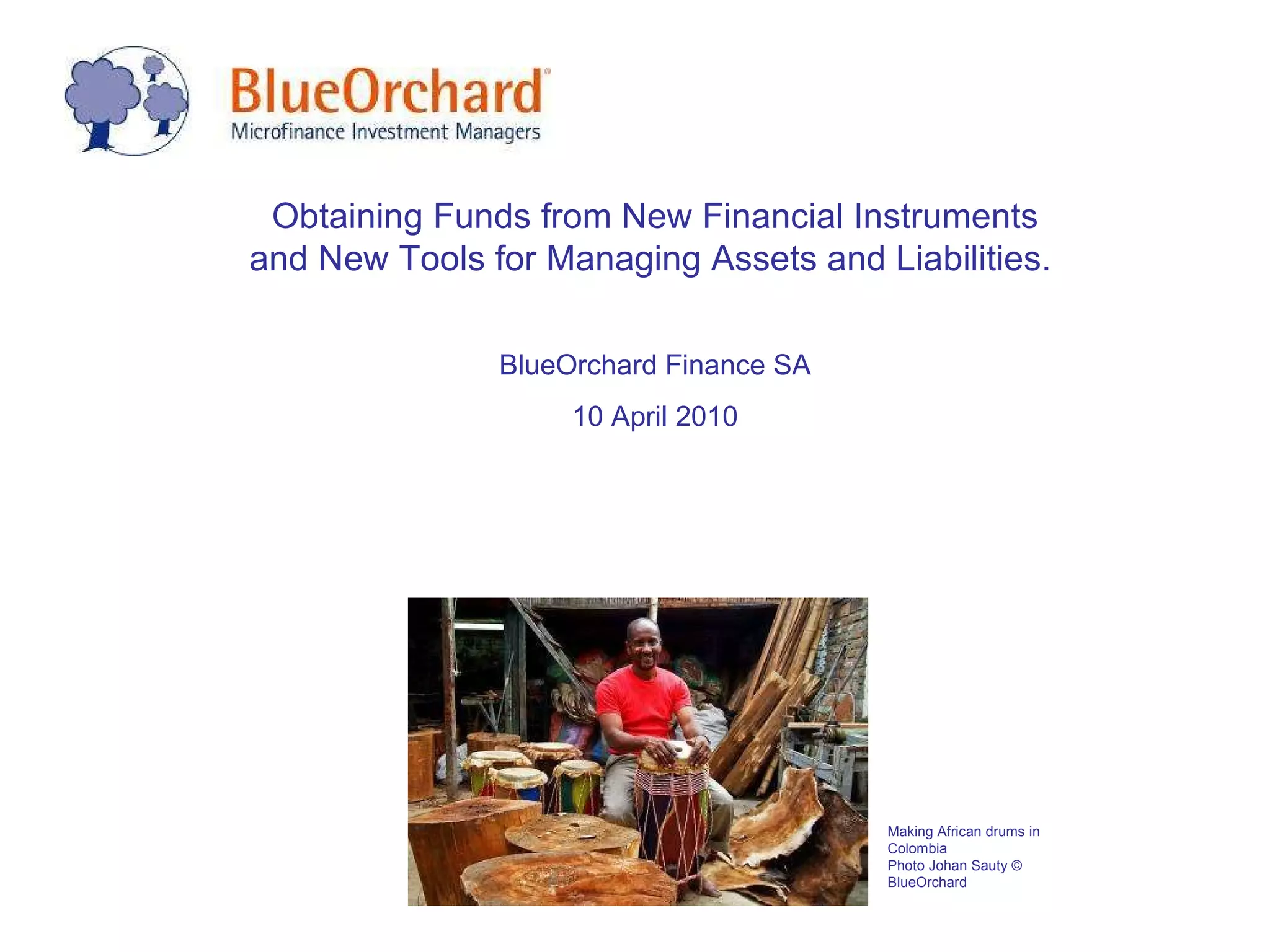 BlueOrchard is a leading commercial microfinance intermediary focused on enabling the poor worldwide through private investments in microfinance. The organization offers innovative financial products and maintains a robust investment portfolio exceeding USD 1 billion in over 125 microfinance institutions across 40 countries as of December 2009. Their mission centers on combining social progress with financial returns, thus supporting economic development and poverty alleviation.