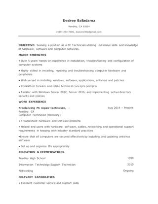 Desiree Balladarez is seeking a position as a PC Technician with over 5 years of experience installing, troubleshooting, and configuring computer systems and hardware. She has worked as a freelance PC repair technician and computer technician where she helped users with hardware, software, networking, and security issues. Balladarez has an information technology support technician certification and ongoing networking education.