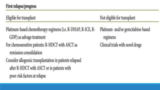 Diffuse large B-cell lymphoma (DLBCL) is the most common type of non-Hodgkin lymphoma, making up 30-40% of cases. DLBCL is an aggressive or intermediate-grade lymphoma characterized by large malignant B cells. Risk factors include family history of lymphoma, autoimmune disease, HIV/HCV infection, and high body mass index. Treatment involves chemotherapy such as R-CHOP along with radiation or stem cell transplant depending on risk factors and age. Prognosis depends on factors like stage and the international prognostic index, with 5-year survival rates around 46% on average.