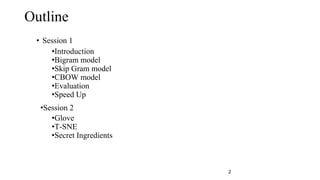 This document provides an overview and introduction to representation learning of text, specifically word vectors. It discusses older techniques like bag-of-words and n-grams, and then introduces modern distributed representations like word2vec's CBOW and Skip-Gram models as well as the GloVe model. The document covers how these models work, are evaluated, and techniques to speed them up like hierarchical softmax and negative sampling.