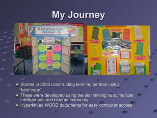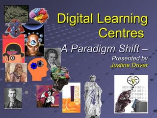 Digital learning centres can be an effective way to reinforce and extend classroom concepts while catering to students' individual learning needs and styles. They allow students to work independently and collaboratively to develop important self-management skills. Creating digital learning centres involves planning purpose and content, designing navigation like a home page and linked pages, and using tools like hyperlinks, buttons and media to guide students through interactive activities. When implemented well with a management system, digital learning centres can serve as maintenance, new learning portals in and outside the classroom.