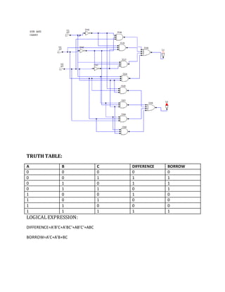The document describes designing a full adder circuit that provides a sum and carry output. It contains a block diagram, truth table, and logical expressions for a full adder. A full adder takes three binary inputs (A, B, C) and produces a sum and carry output based on the inputs. The sum is calculated as A'B'C + A'BC' + AB'C' + ABC and the carry is calculated as A'BC + AB'C + ABC' + ABC.