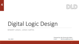 This document provides information about digital logic design and binary logic. It discusses binary variables that can take on values of 1 or 0, and logical operations on these variables. It defines logic gates like AND, OR, and NOT and shows their truth tables. It also covers Boolean algebra, Boolean functions, canonical forms including minterms and maxterms, and properties of Boolean algebra.