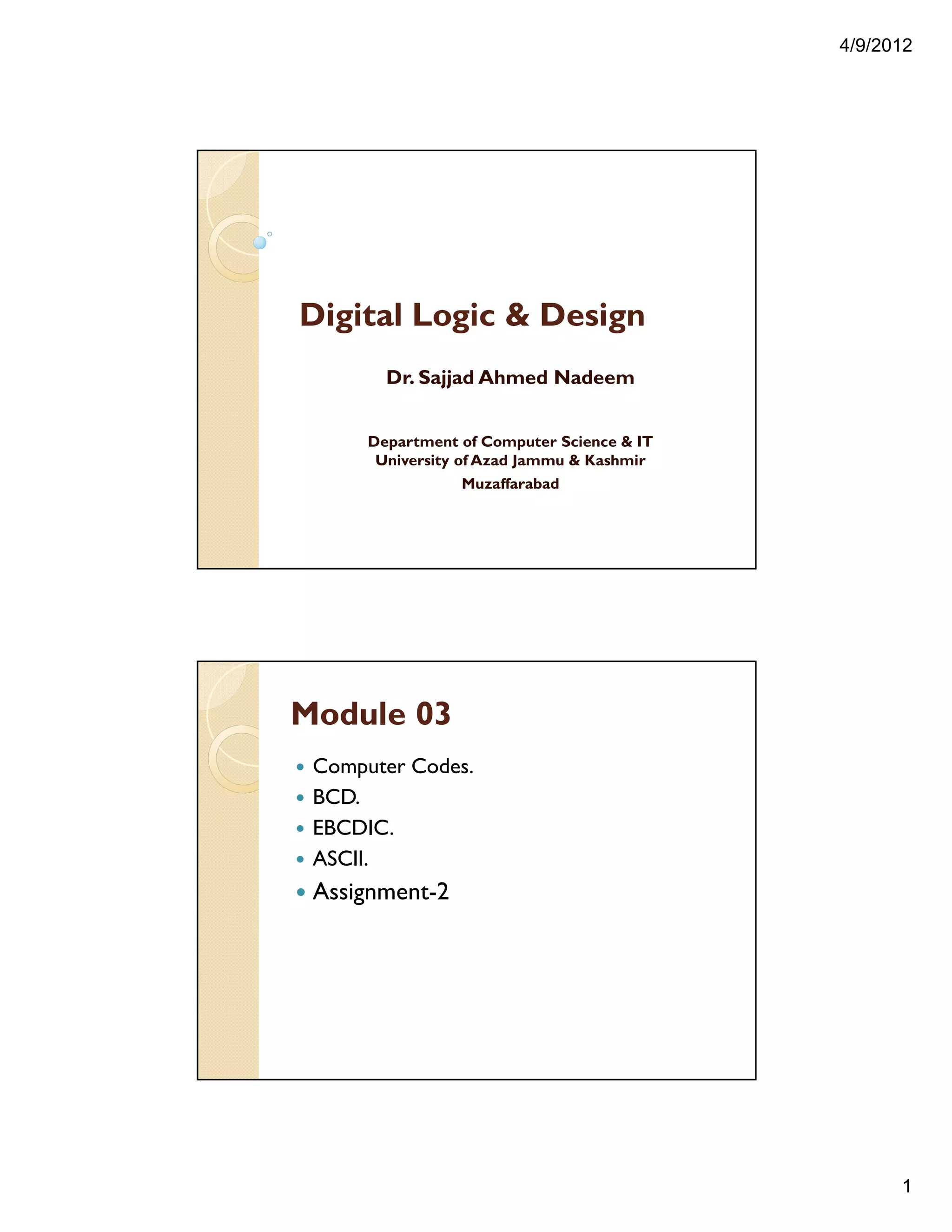 This document contains lecture notes on computer codes including BCD, EBCDIC, ASCII, and other coding systems. It discusses the binary representations of decimal digits in BCD code and provides examples of BCD addition. It also describes EBCDIC, ASCII, control codes, and the coding of alphabetic and numeric characters in these standards.