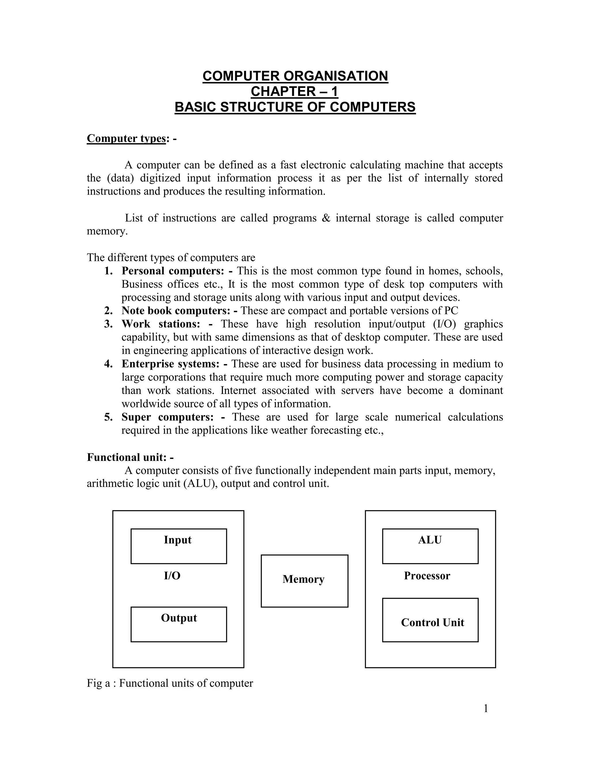 1. The five main functional units of a computer: input, memory, arithmetic logic unit (ALU), output, and control unit. Memory can be primary or secondary.
