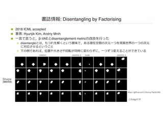 The document discusses FactorVAE, a method for disentangling latent representations in variational autoencoders (VAEs). It introduces Total Correlation (TC) as a penalty term that encourages independence between latent variables. TC is added to the standard VAE objective function to guide the model to learn disentangled representations. The document provides details on how TC is defined and computed based on the density-ratio trick from generative adversarial networks. It also discusses how FactorVAE uses TC to learn disentangled representations and can be evaluated using a disentanglement metric.