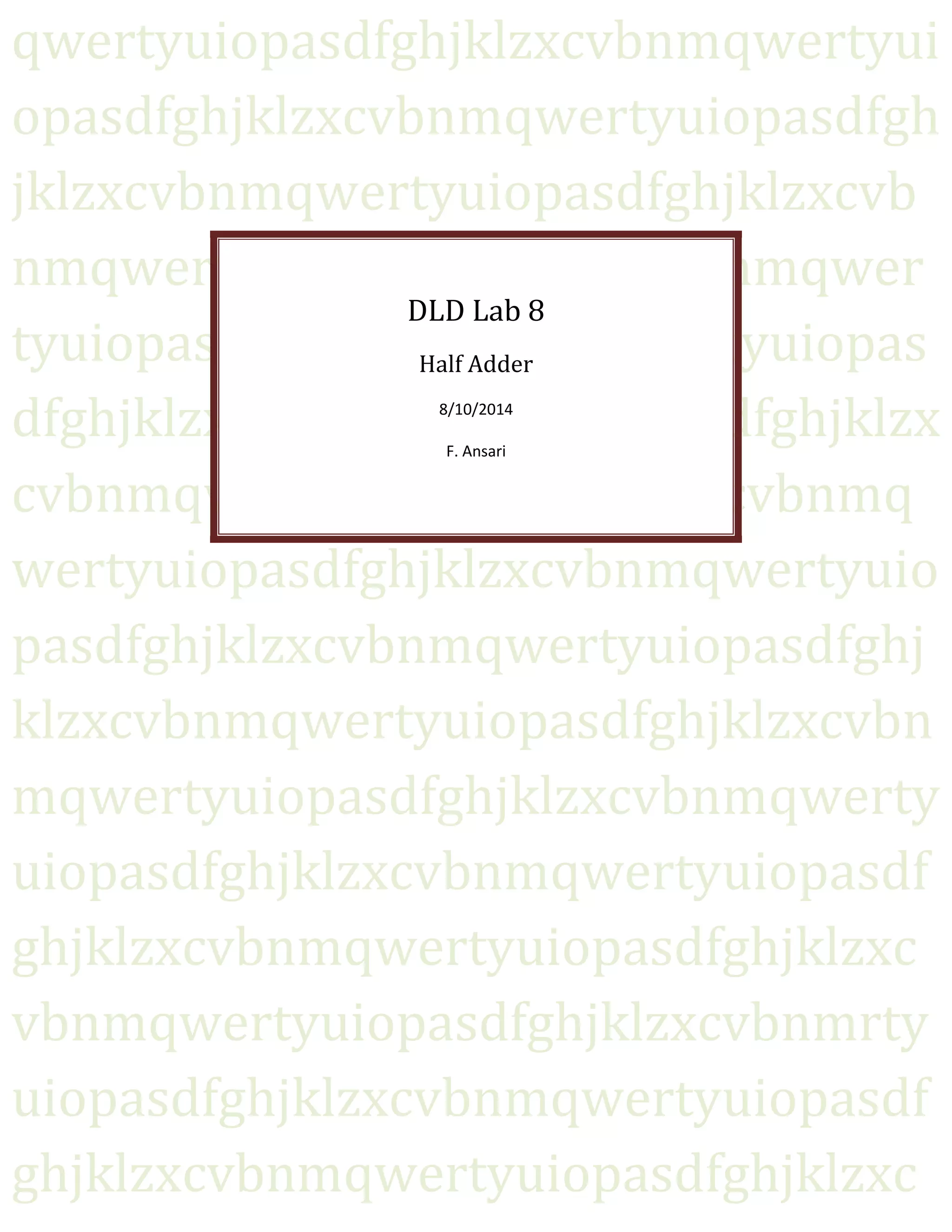 This document describes an experiment to study the operation of a half adder circuit using XOR and AND gates. The circuit was built using two ICs - 74LS86 and 74LS08 - on a breadboard. The 74LS86 IC implements the XOR function and the 74LS08 IC implements the AND function. Different input combinations of 0s and 1s were applied to the circuit using switches and the corresponding outputs for sum and carry were observed on LEDs, verifying the truth table of a half adder. The objective of studying the working of a half adder circuit was achieved through this experiment.