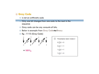 Digital systems use discrete binary values represented as 0s and 1s to process information. Common digital systems include computers, cameras, calculators, televisions and more. Analog systems represent information as continuously variable physical quantities, while digital systems represent information as discrete values. Binary digits (bits) are the fundamental units of digital systems and can have values of 0, 1, low, high, on or off. Logic gates like AND, OR, NOT, NAND and NOR are basic building blocks used to perform operations on binary inputs and produce binary outputs.