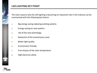 The document discusses the advantages of LED street lights over traditional lighting options. Some key points covered include: