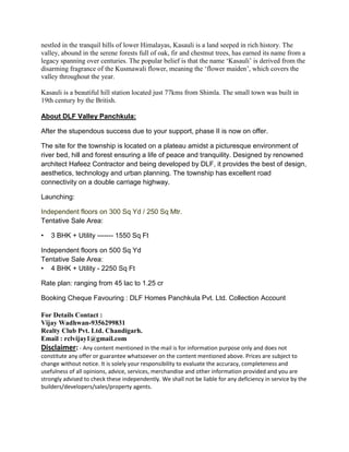 DLF is a major real estate developer in India known for its shopping malls. It is developing several new projects including residential apartments and retail spaces. The document provides information about three specific projects - Mullanpur Eco Town in Punjab, the hill station of Kasauli in Himachal Pradesh, and DLF Valley in Panchkula, Haryana. Mullanpur is being developed as Punjab's first eco-town on over 6,000 hectares with various residential, commercial and recreational amenities. Kasauli is known for its natural beauty and history. DLF Valley Phase 2 in Panchkula is launching independent floors ranging from 1,550 to 2,250 square feet, priced between 45 lakhs