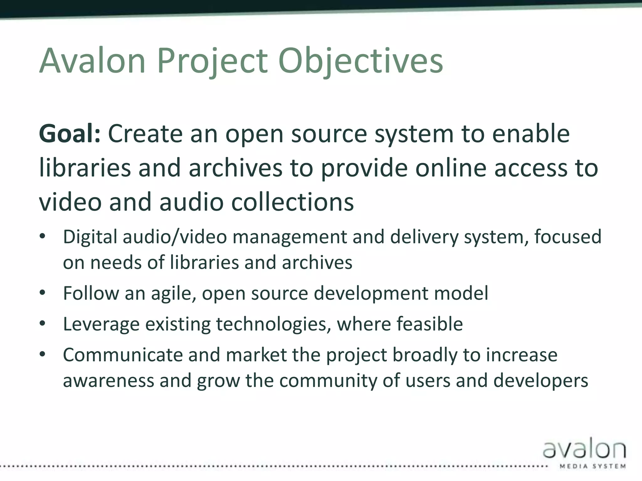 The Avalon Media System is an open-source digital audio/video management and delivery system aimed at libraries and archives, developed collaboratively by Indiana University, Northwestern University, and others. It operates under an agile development model and has undergone several version releases since its planning stage in 2010. Current efforts include implementing new features and engaging with the community for code contributions and sustainability strategies.