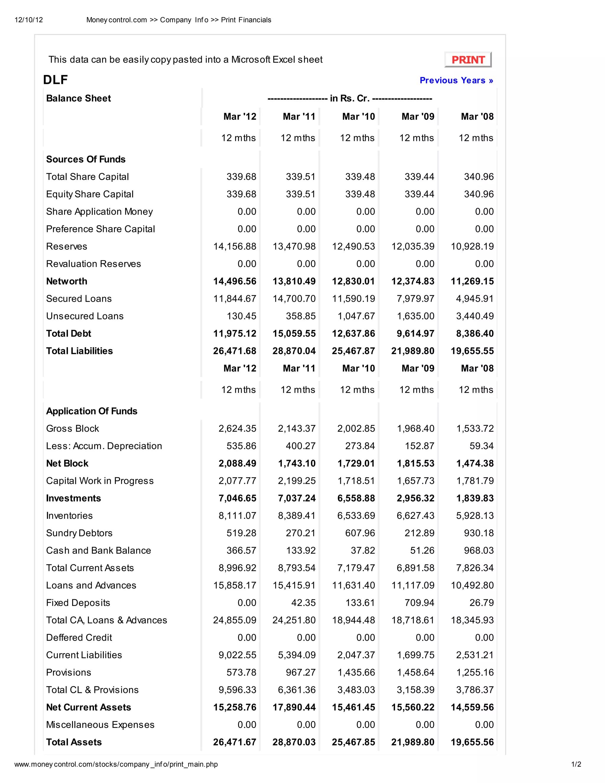 This document contains financial data from the balance sheets of DLF from March 2008 to March 2012. It shows the company's sources of funds including share capital, reserves, net worth, secured and unsecured loans. It also shows the application of funds including gross block, capital work in progress, investments, inventories, debtors, cash, loans and advances. Key figures include total assets increasing from Rs. 19,655 crore in March 2008 to Rs. 26,472 crore in March 2012 with net worth growing from Rs. 11,269 crore to Rs. 14,497 crore over the same period. Contingent liabilities also increased from Rs. 3,048 crore to Rs. 12,720