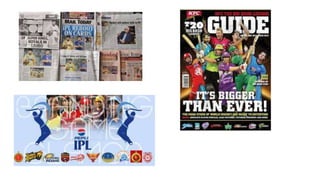 The document discusses the Indian Premier League (IPL), a professional Twenty20 cricket league established by the Board of Control for Cricket in India in 2008. It summarizes Lalit Modi's vision in founding the IPL to nurture local cricket talent through a competitive league structure. The IPL was highly successful in attracting massive viewership and generating substantial revenue through franchise fees, broadcasting rights deals, sponsorship agreements, and other avenues. However, some warned that the short format could damage the long-term appeal and integrity of the game.