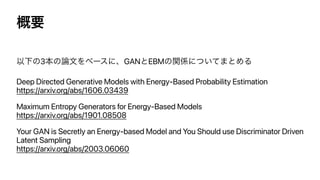 This document discusses the connections between generative adversarial networks (GANs) and energy-based models (EBMs). It shows that GAN training can be interpreted as approximating maximum likelihood training of an EBM by replacing the intractable data distribution with a generator distribution. Specifically: