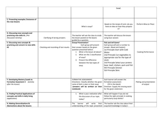 This document outlines the daily lesson log for a cookery class in Grade 10. Over four days, students will learn about stocks, sauces, and soups. They will classify different types of stocks and soups, learn the basic principles of preparing them, and demonstrate these skills by independently preparing various stocks and soups from different cultures. Assessment activities include quizzes, presentations, and evaluating students' abilities to classify soups, list preparation principles, and arrange the steps to make soup. The teacher reflects on students' performance and strategies for improvement.
