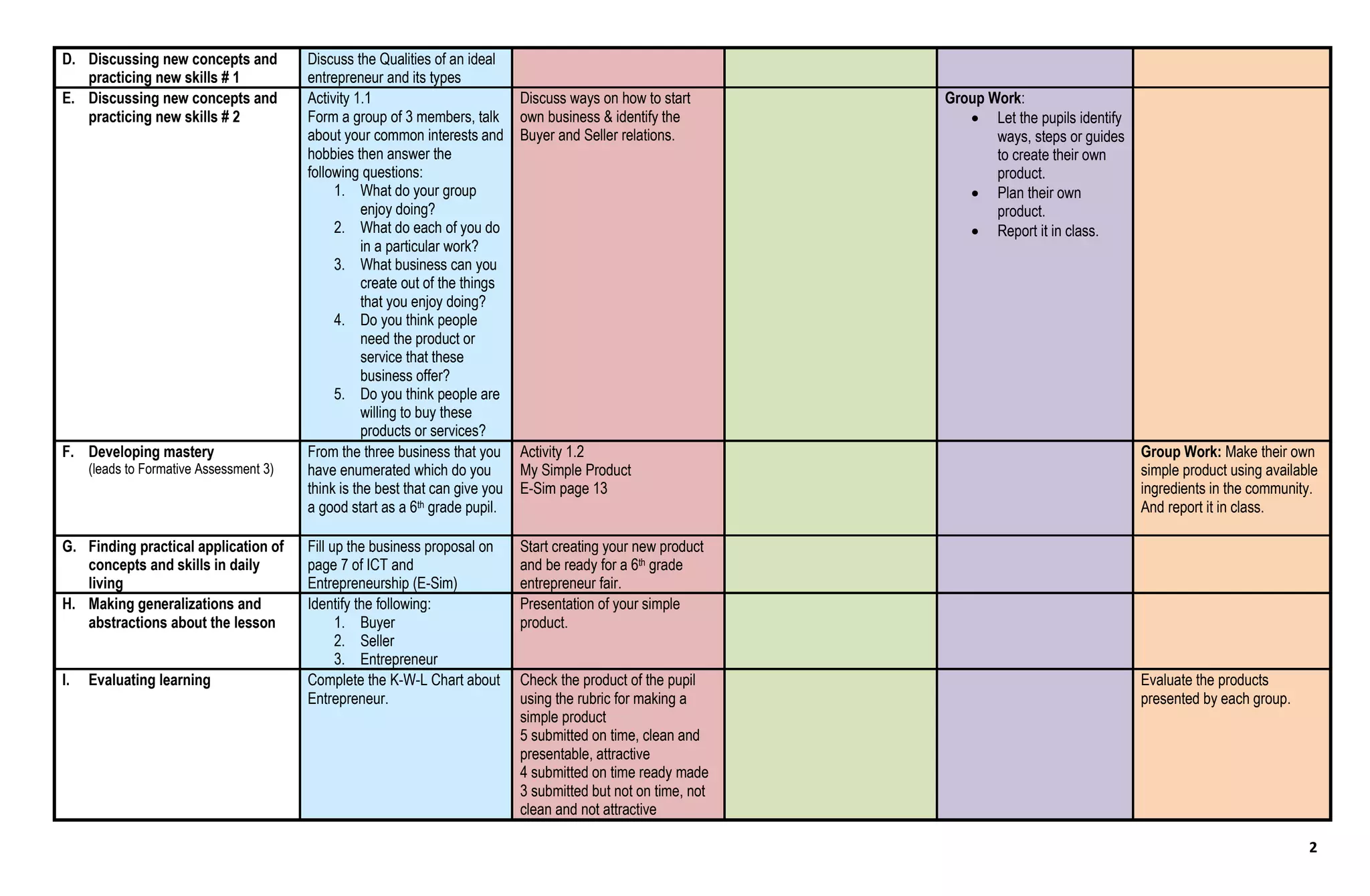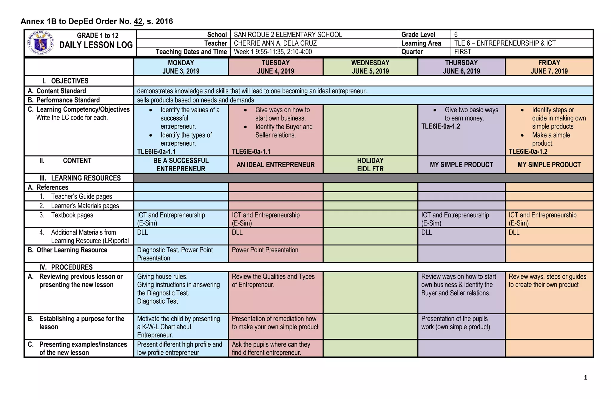 This document outlines the daily lesson log and plan for an Entrepreneurship and ICT class for 6th grade students. The plan covers several lessons across multiple weeks. The objectives are to teach students about entrepreneurship, including qualities of successful entrepreneurs, how to start a business, the buying and selling process, and how to create simple products. It also covers using technology tools like wikis, blogs, and practicing internet safety. Key activities include students creating business proposals, advertisements for their products, setting up wiki and blog accounts, and conducting role plays about selling products. The teacher reflects on student progress and ways to improve instruction.