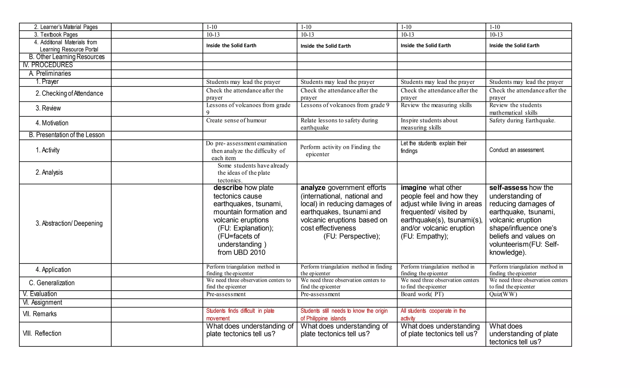 This document outlines the objectives, content, activities, and evaluation for four classroom sessions on plate tectonics and earthquake epicenters. The sessions aim to teach students about the relationship between volcanoes, earthquake epicenters, and mountain ranges. Students will learn about plate tectonics and how to use triangulation to locate an earthquake epicenter on a map. Assessment methods include a pre-assessment quiz, board work, and activities having students apply triangulation to find epicenters. The final day will include a reflection on what understanding of plate tectonics reveals.