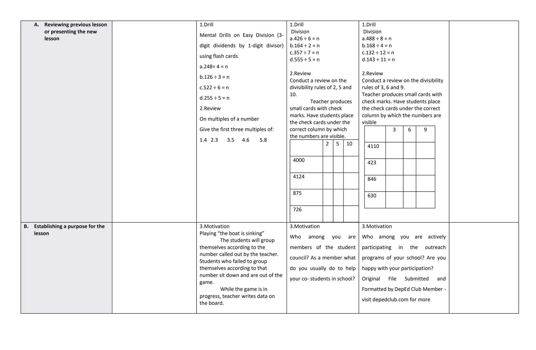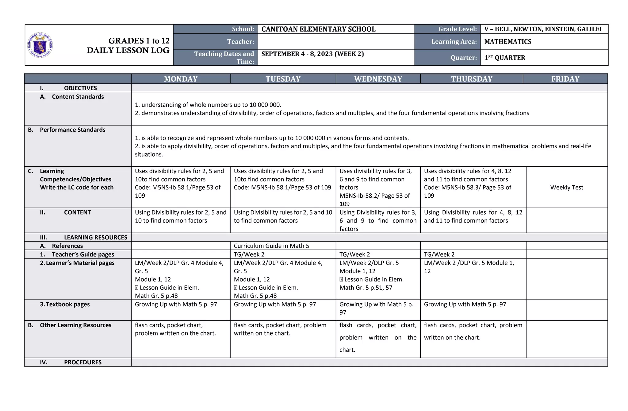 The document provides a daily lesson log for a 5th grade mathematics class. It details the objectives, content, procedures, and assessment for a week of lessons on using divisibility rules to find common factors of numbers. The lessons cover divisibility rules for 2, 5, 10, 3, 6, 9, 4, 8, 12, and 11. Students practice applying the rules through drills, group activities, and word problems. Formative assessments evaluate students' mastery of using divisibility rules to determine the factors of given numbers.