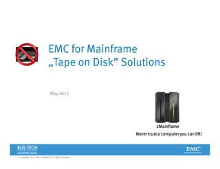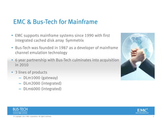 1. The document discusses EMC's mainframe tape solutions, including the Disk Library for Mainframe products. It provides details on the DLm1000, DLm2000, and DLm6000 products and how they emulate tape drives for mainframe environments.